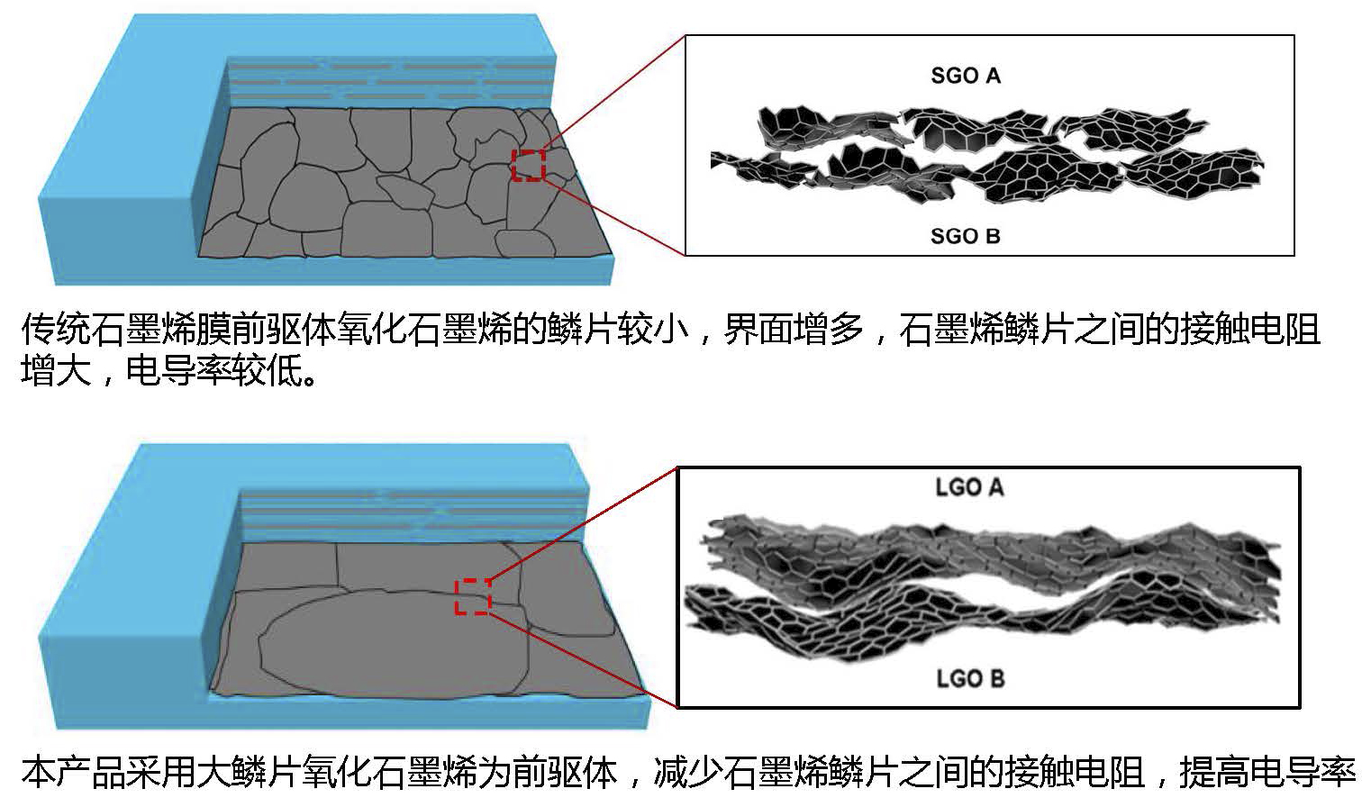 1、导电性能:由于宏观石墨烯导电膜为多层大鳞片石墨烯嵌合重叠构成,具有高导电性能,电导率随着厚度的增加而减少,电导率为1~5×10^6 S/m可调。